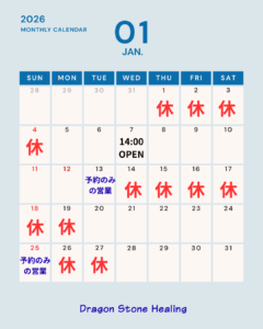 2026年1月5日 / 最終更新日時 : 2026年1月5日 dragonstone2020 未分類 2026年 令和8年もよろしくお願いいたします 令和8年 丙午の年がスタートいたしました。 今月の営業カレンダーを掲載しておきます。 変更がある場合にはInstagram、ストーリーにてお知らせいたします。 併せてご確認お願いいたします。 Facebooktwitter